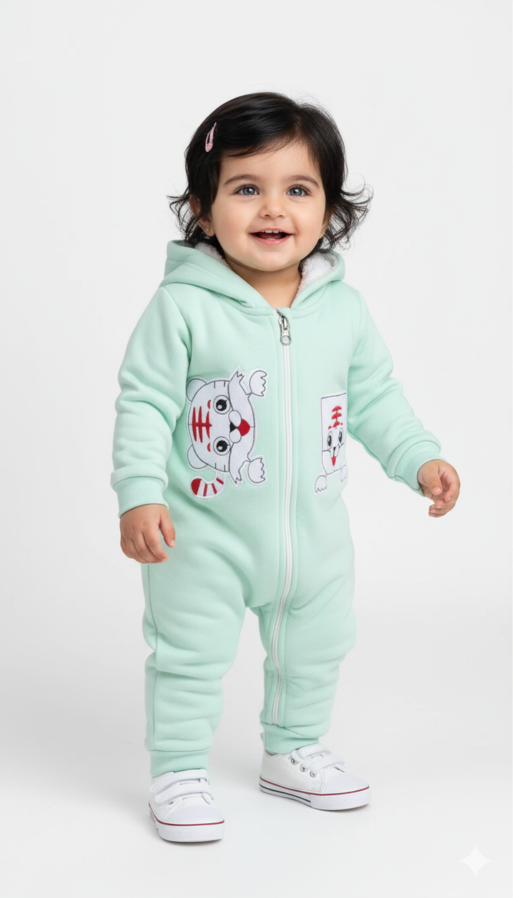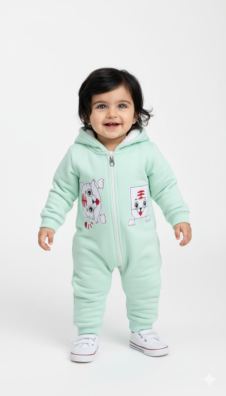 Tiny Tiger Sea Green Hooded Fleece Warm Romper